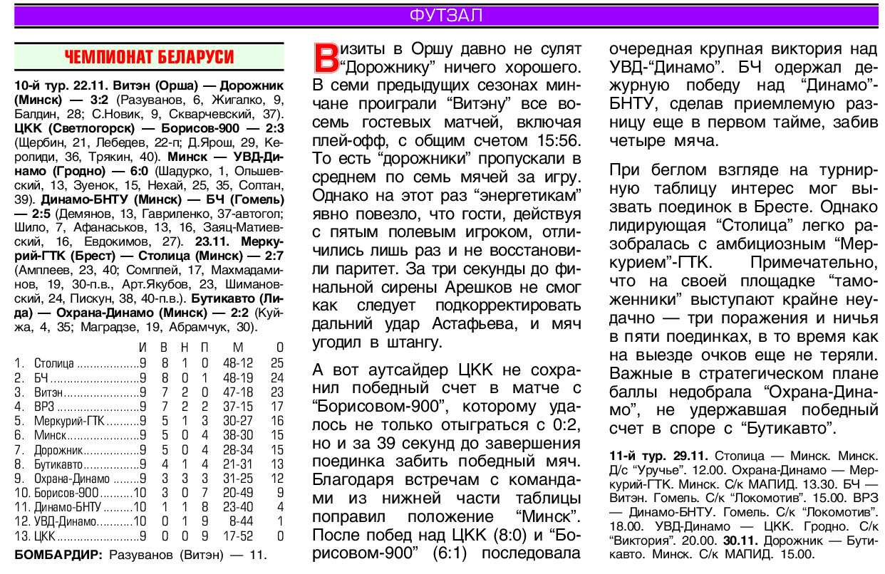 По традиции на сайте МФК «Столица» мы подводим итоги прошедшего тура с полной статистикой всех матчей, где указаны не только ассистенты при голевых «выстрелах», но и показатели по системе «плюс/минус» (статистический показатель полезности игрока, который отражает разность забитых и пропущенных командой мячей в то время, когда тот или иной игрок находился на площадке). Турнирная таблица, списки лучших бомбардиров, снайперов и самых полезных, символическая сборная, лучший игрок тура, ссылки на видеотрансляции и видеообзоры, 10-ка самых красивых голов, выпуски «Ясно о мини-футболе» и «Пятого полевого», репортаж об итогах из газеты «Прессбол» – вся информация о минувшем туре под одним заголовком!