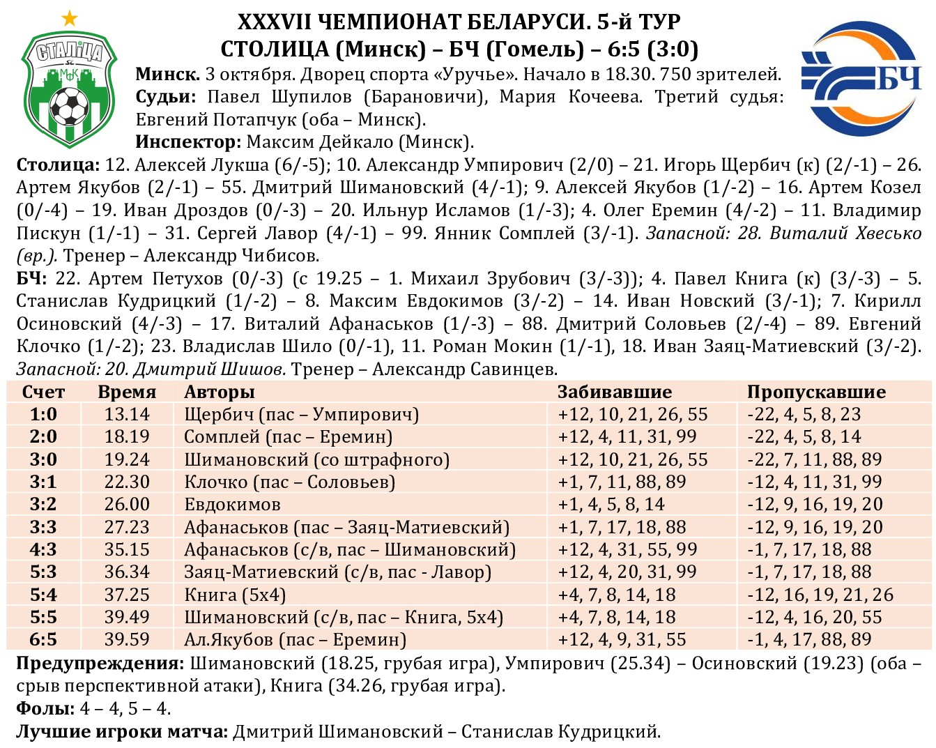 После достаточно скучного первого тайма, в котором «столичники» в концовке уверенно склонили чашу весов в свою пользу, безукоризненно реализовав три «стандарта», вряд ли кто-то мог предположить, какой захватывающей и по-настоящему «валидольной» окажется вторая половина встречи. До перерыва наша команда создала себе комфортный перевес в три мяча, когда Щербич забил после розыгрыша углового, Сомплей – аута, а Шимановский – прямым ударом со штрафного. Четыре кряду тайма подряд – на «ноль»! Однако «сухая» «столичная» серия прервалась на цифрах «89.49». Первый гол «железнодорожников» был воспринят как досадное недоразумение, второй – как призыв к возвращению в игру из раздевалки, ну а третий – просто привел хозяев в нокдаун. Продли гости свой атакующий порыв – быть беде! Но они, словно испугавшись невесть откуда свалившейся голевой феерии, посчитали ничейный результат за благо и достаточно низко «сели», позволив пришедшим в себя «столичникам» активизироваться. За настойчивость хозяева были вознаграждены двумя кряду автоголами в исполнении гомельчан, неудачно выбивавших мячи после прострелов с левого фланга. В надежде спасти игру Александр Савинцев отправил на площадку пятого полевого игрока, и за 11 (!) секунд до финальной сирены капитан гостей Павел Книга в жестком столкновении с голкипером сумел протолкнуть мяч вперед, тот угодил в штангу, затем в ногу Дмитрия Шимановского и срикошетил в сетку – 5:5. Главком «Столицы» Александр Чибисов тут же взял тайм-аут и отправил в «последний бой» сборный коллектив из всех трех квартетов. К атаке подключился и Алексей Лукша, мощным ударом угодив в Станислава Кудрицкого. Тому потребовалась медицинская помощь, замена на Книгу, а на табло несыгранными оставались всего 2 секунды. «Столичники» вводили мяч из аута. Лавор пробежал, а Еремин нашел «отклеившегося» от Книги Якубова-младшего, и Алексей, находясь спиной к воротам, технично, «а-ля Прокопенко», переправил мяч в сетку. За секунду до окончания игрового времени! Такая непростая виктория, дающая очень много пищи для размышлений тренерскому штабу. Через неделю – в субботу, 11 октября, снова игра с гомельчанами, на этот раз – на выезде с ВРЗ. На всякий случай, с новым лидером чемпионата. Но «Столице» в этом сезоне не впервой свергать с вершины турнирной таблицы лидирующие команды!