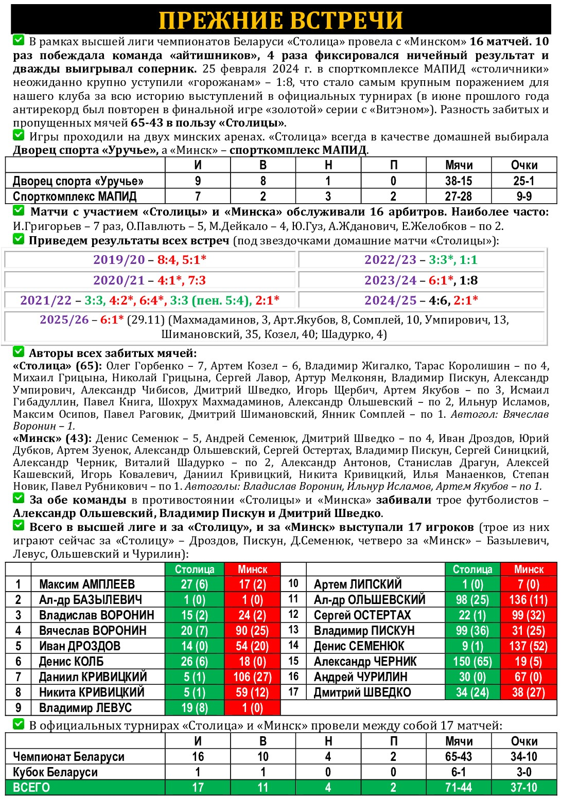 Всего три тура остается провести командам на турнирной дистанции регулярного чемпионата. Его победитель уже известен. Приятно в очередной раз напомнить, что досрочно, за 4 игры до промежуточного финиша им стала «Столица». Известно также, что 11-е место при любом раскладе у «УВД-Динамо», а вот за остальные места, в том числе в зоне плей-офф, борьба ожидается нешуточная. Участие в «майском безумии» обеспечили себе только пять команд: добавляем БЧ, «Витэн», ВРЗ и «Меркурий-ГТК». На оставшиеся три позиции претендуют 4 коллектива: «Минск», «Дорожник», «Охрана-Динамо» и «ФСК-Бутикавто». Вот потому-то грядущее минское дерби имеет куда большее значение для дружины Александра Черника, нежели Александра Чибисова. У «горожан» потом матчи с «соседями» по спорткомплексу МАПИД – «Охраной» и «Дорожником». Впрочем, осечки конкурентов (в первую очередь, Лиды) могут облегчить «Минску» выполнение задачи. Вероятность участия клуба в плей-офф – процентов 90. Однако на данном этапе это максимум, что можно выжать из команды. Потеря в межсезонье почти десятка футболистов и набор вместо них новых вывели «горожан» из числа претендентов на медали, но матчи со «Столицей» – это уже принципиальное соперничество, в котором легко никому не будет. «Минск» в 7 последних матчах записал в свой актив 6 викторий, «Столица» же и вовсе в этом чемпионате никому не проигрывала, одержав 14 побед подряд (а с учетом Кубка – 19!). Найдет коса на камень?! Из-за перебора желтых карточек не сыграет за «Минск» Виталий Шадурко, а вот для Владимира Пискуна игра против бывшего клуба станет юбилейной, 100-й, в составе «Столицы». Резюмируем: мини-футбола много не бывает, третья игра за неделю. И посему приглашаем всех наших болельщиков посетить в субботу спорткомплекс МАПИД на Шаранговича, 20 и отдать свои эмоции любимой команде! Начало – в 15.05, прямая трансляция на «ЯСНАе TV». Болеем за наших! Важны – кожны!