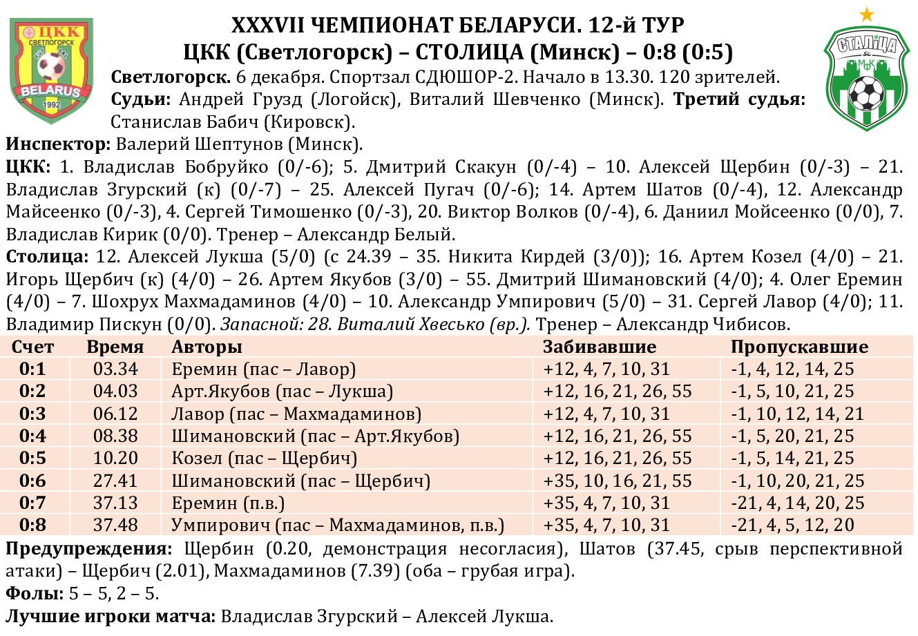 Результаты остальных матчей 12-го тура: 6.12. Минск – Охрана-Динамо – 4:7 (2:3) (А.Семенюк, 1, Кашевский, 12, Шадурко, 37, Белоножко, 39; Филипчик, 2, Гаркун, 13, Бабич, 17, 21, 37, Абрамчук, 34, Михалевич, 36). Борисов-900 – УВД-Динамо – 5:2 (2:0) (Керолиди, 2, 37, Носаль, 9, Миронов, 24, Баркун, 36; Чирич, 37, 39). Витэн – ВРЗ – 5:3 (2:2) (Жигалко, 4, Рабыко, 10, Разуванов, 27, Балдин, 30, Манаенков, 30; Березовский, 6, 13, Чернейко, 39). 7.12. Меркурий-ГТК – Дорожник – 4:2 (1:1) (Хвисюк, 15, Осипов, 23, Амплеев, 25, Кремко, 31; Амплеев, 20-с/в, Астафьев, 33). ФСК-Бутикавто – БЧ – 2:4 (0:3) (Живушко, 32, 37; Книга, 14, Куйжа, 14-с/в, Клочко, 15, Мокин, 21).