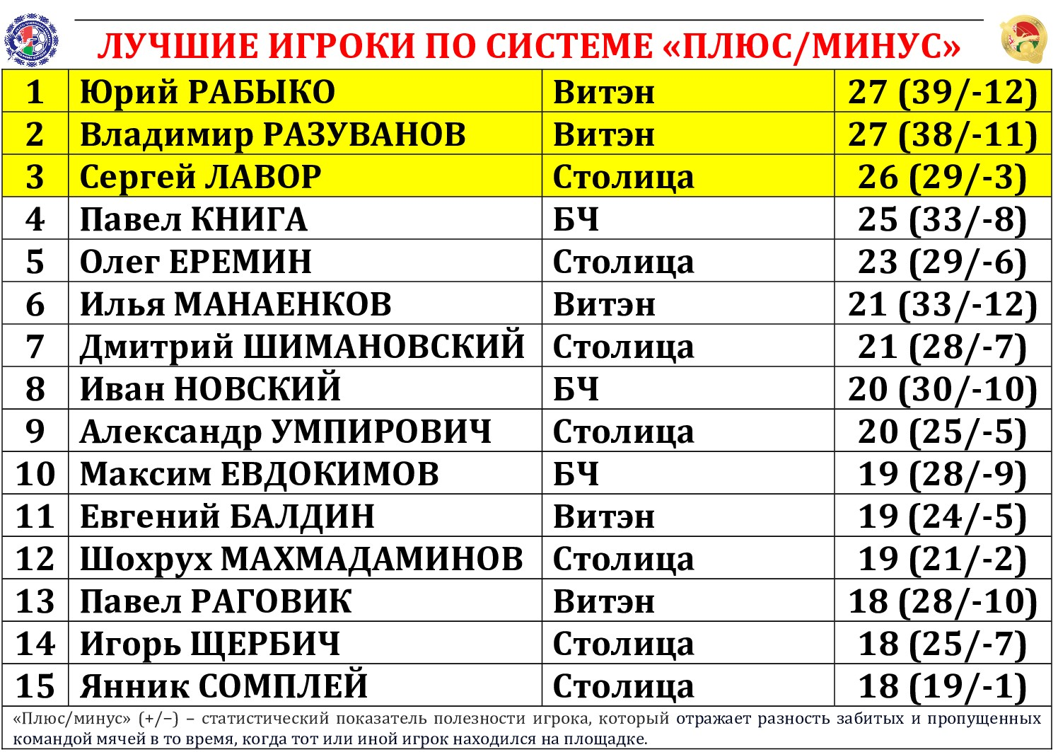 По традиции на сайте МФК «Столица» мы подводим итоги прошедшего тура с полной статистикой всех матчей, где указаны не только ассистенты при голевых «выстрелах», но и показатели по системе «плюс/минус» (статистический показатель полезности игрока, который отражает разность забитых и пропущенных командой мячей в то время, когда тот или иной игрок находился на площадке). Турнирная таблица, списки лучших бомбардиров, снайперов и самых полезных, символическая сборная, лучший игрок тура, ссылки на видеотрансляции и видеообзоры, 10-ка самых красивых голов, выпуски телепрограмм «Ясно о мини-футболе» и «Пятый полевой», репортаж об итогах из газеты «Прессбол» – вся информация о минувшем туре под одним заголовком!