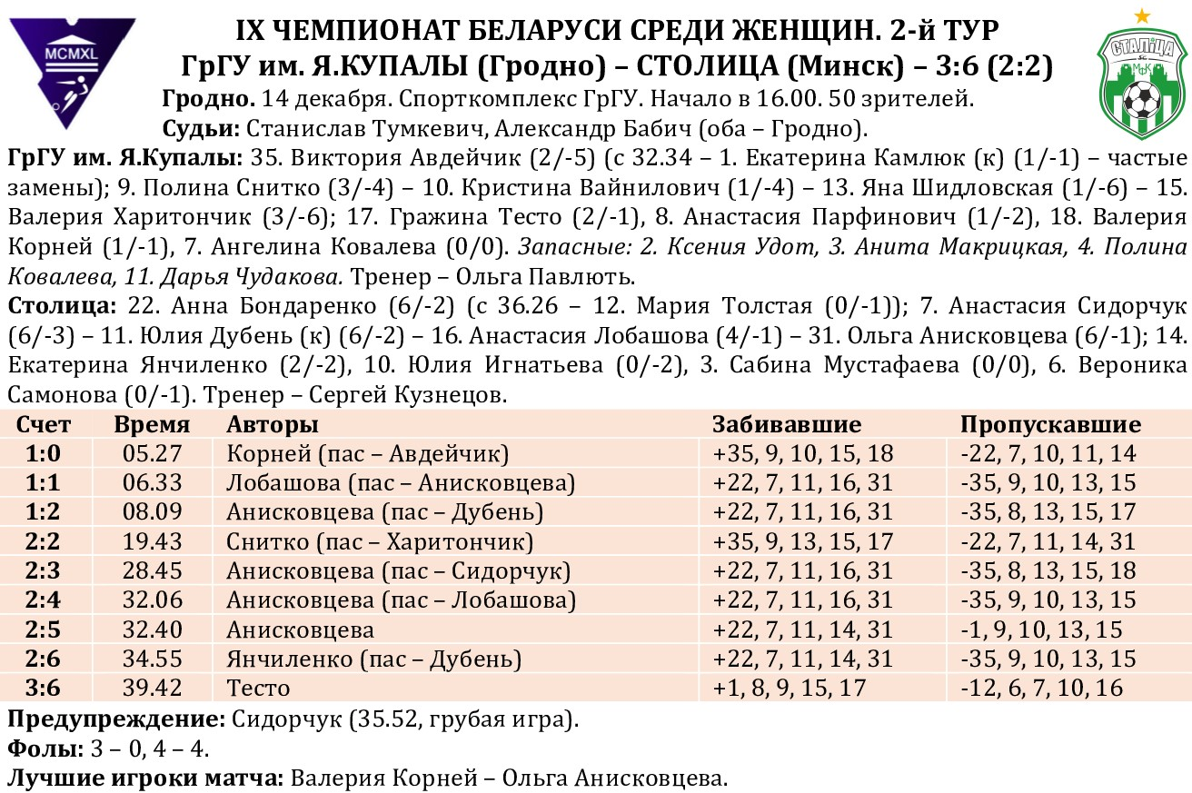 Результаты остальных матчей 2-го тура: 13.12. БГУФК – Вортекс – 10:0 (6:0) (Калиновская, 8, 9, 34, 37, Тарадуда, 14, Синявская, 18, Ващук, 19, 19, Капыша, 24, 34). 14.12. ПолесГУ – Университет – 0:2 (0:1) (Хорощак, 20, Касяник, 28).