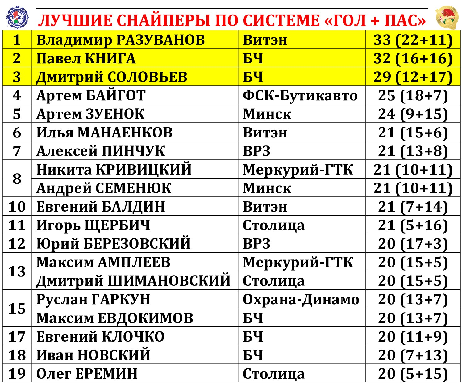 Виталий ХВЕСЬКО (Столица); Артем НОВИК (УВД-Динамо) – Александр НЕХАЙ (Минск) – Евгений ПЕРЕМИТИН (Витэн) – Юрий ДУБКОВ (ВРЗ)