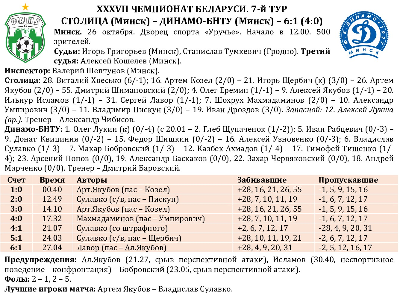 Результаты остальных матчей 7-го тура: 25.10. УВД-Динамо – Витэн – 1:7 (0:4) (А.Кириллов, 34; Лазюк, 2, Манаенков, 9, 37, Разуванов, 16, Бреднев, 18, Батурин, 23, Рабыко, 30). Охрана-Динамо – ВРЗ – 1:1 (0:0) (Баньков, 23; Селюк, 39-п). ЦКК – Меркурий-ГТК – 2:7 (1:5) (Туз, 6, Пугач, 40; Кичкин, 4-с/в, Н.Кривицкий, 9, Остертах, 11, Амплеев, 14, 18, 27, Афонин, 31). 26.10. Борисов-900 – ФСК-Бутикавто – 2:7 (1:3) (Носаль, 17, Д.Ярош, 38; А.Байгот, 9, 25, 34, Живушко, 12, 18, 35, Куйжа, 33). Дорожник – БЧ – 2:5 (2:1) (Титко, 10, Грицук, 18; Заяц-Матиевский, 19, 36, 38, Мокин, 33, Подобед, 40-с/в).