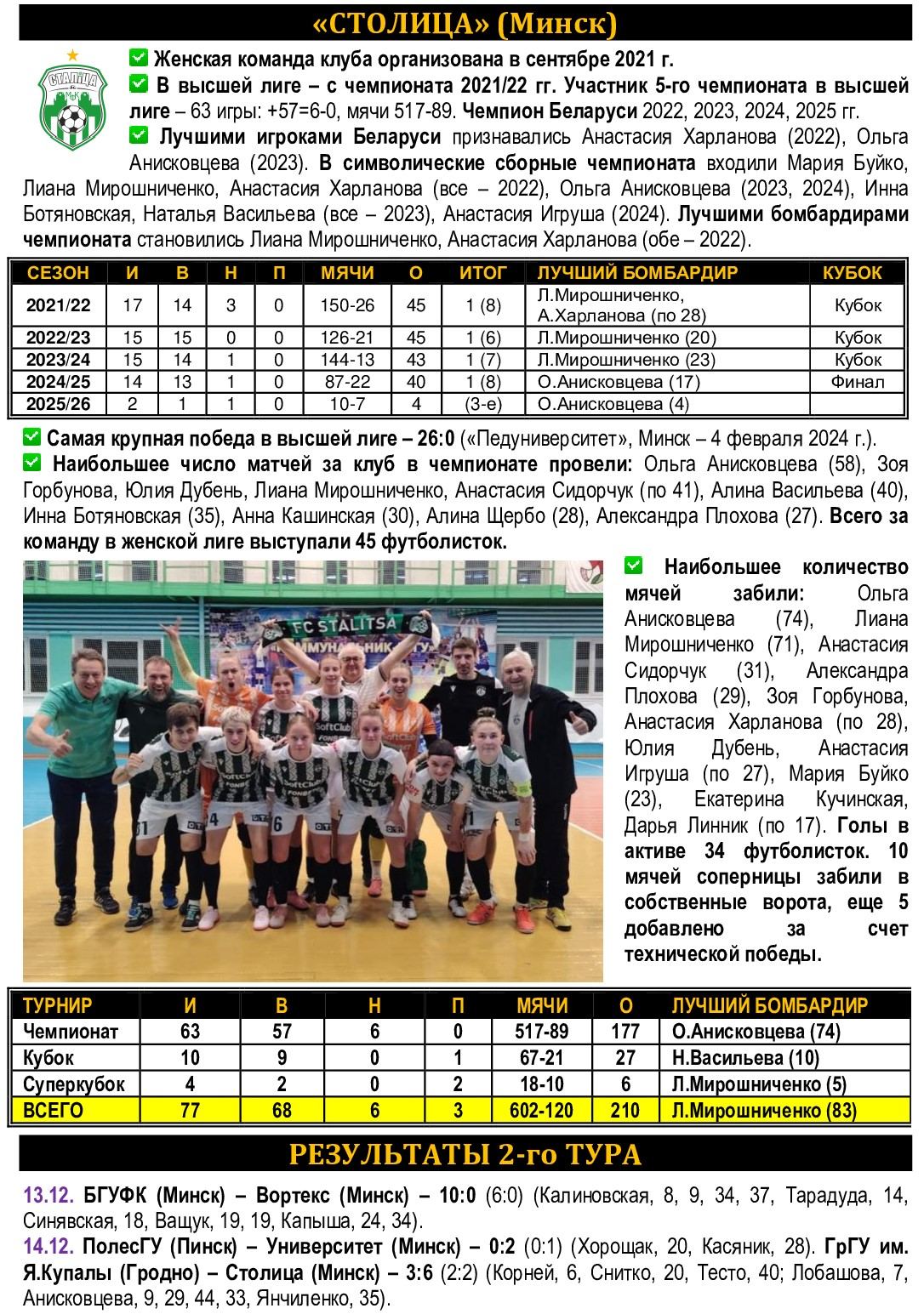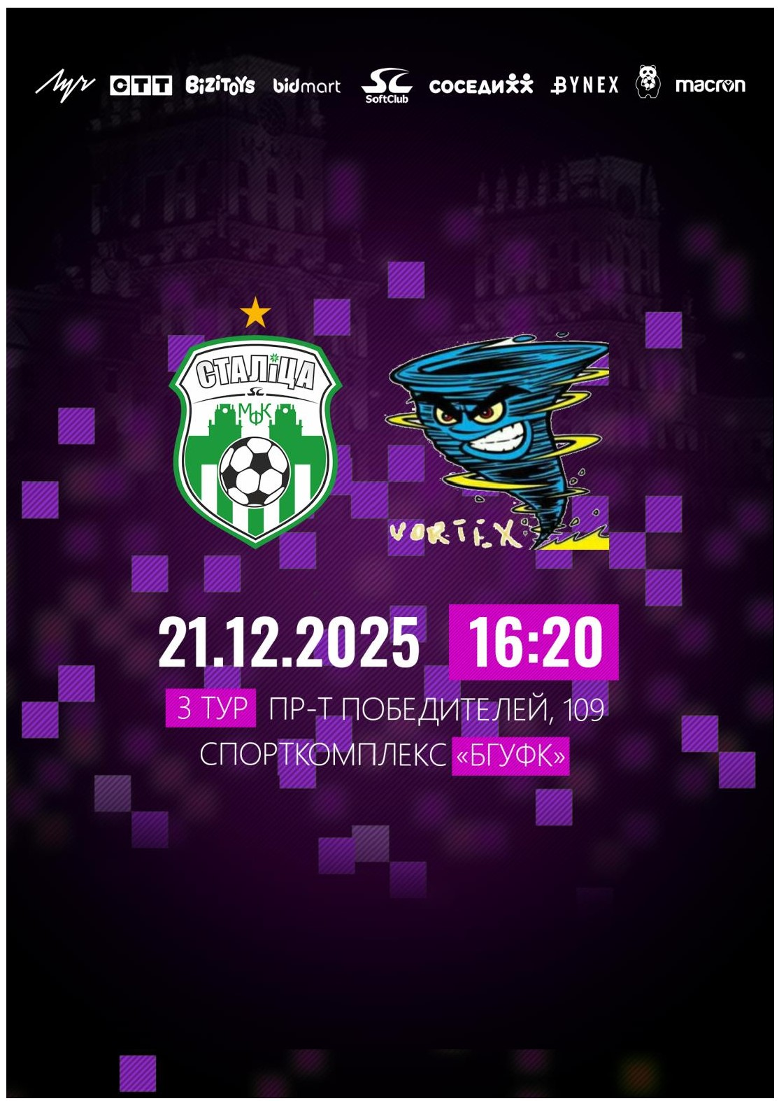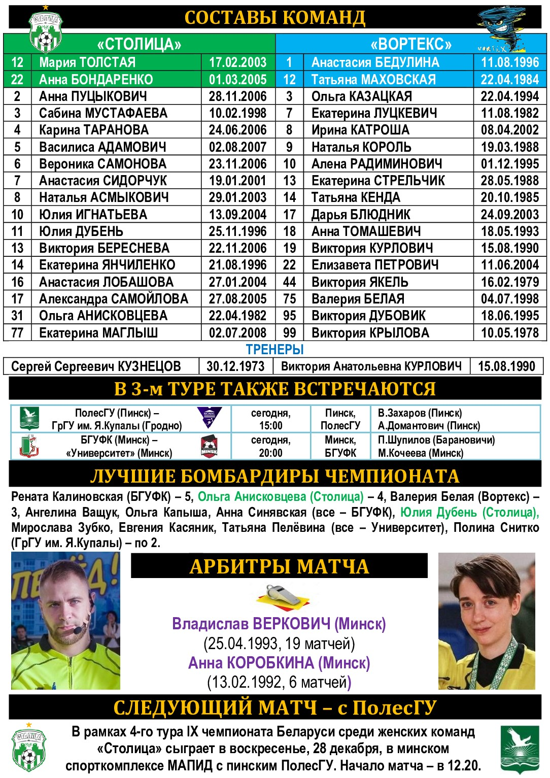 Два последних сезона наш воскресный соперник оказывался на ближайших подступах к пьедесталу, довольствуясь «деревянными» медалями за четвертые места. И этот сезон, заполучив в свои ряды «сборницу» Валерию Белую, дружина Виктории Курлович начала за здравие, одолев в Пинске местных студенток. Однако уже в следующем туре «Вортекс» оказался нещадно бит дебютантом БГУФКом – 0:10, что пока не дает какого-то оценочного показателя, на что команда способна в нынешнем сезоне. Будут ли высупать за команду внесенные в заявку, но пока не сыгравшие за нее именитые по мини-футбольным меркам Лиана Мирошниченко, Анастасия Игруша, Диана Тропникова, та же Белая? С ними и без них – это абсолютно разные коллективы, с разным потенциалом. На этой неделе проходит Республиканская Универсиада по мини-футболу среди женщин, многие девчонки, обучающиеся в вузах, в ней задействованы, поэтому «Столица» свой матч 3-го тура проведет в воскресенье, 21 декабря, в спорткомплексе БГУФК. Начало в 16.20.