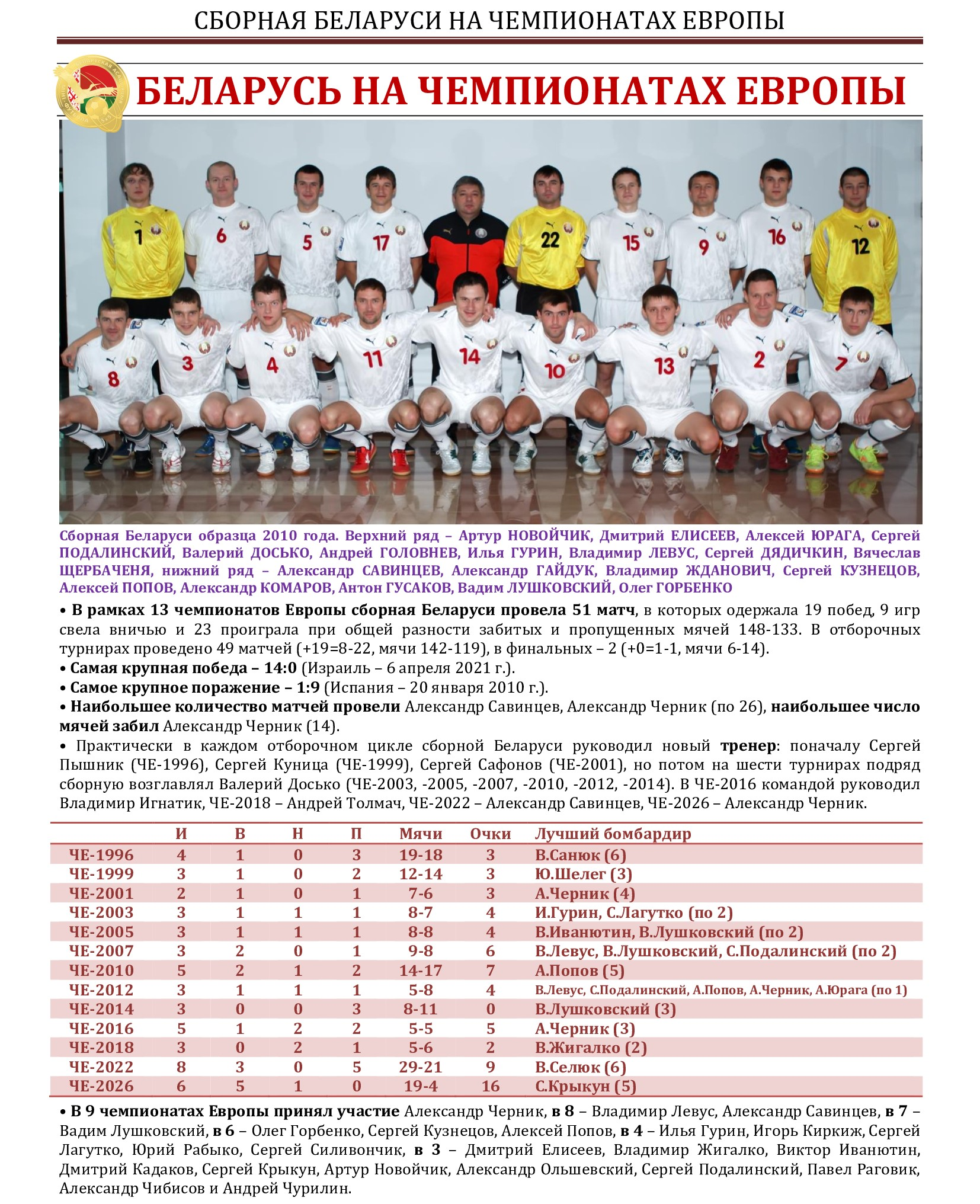 Главный тренер сборной Беларуси Александр Черник и его ассистенты Игорь Федоринчик и Павел Швайба обнародовали список из 16 футболистов, которые вызваны на сбор в Малориту, где команда проведет заключительный этап подготовки к чемпионату Европы. Шесть из них представляют минскую "Столицу".