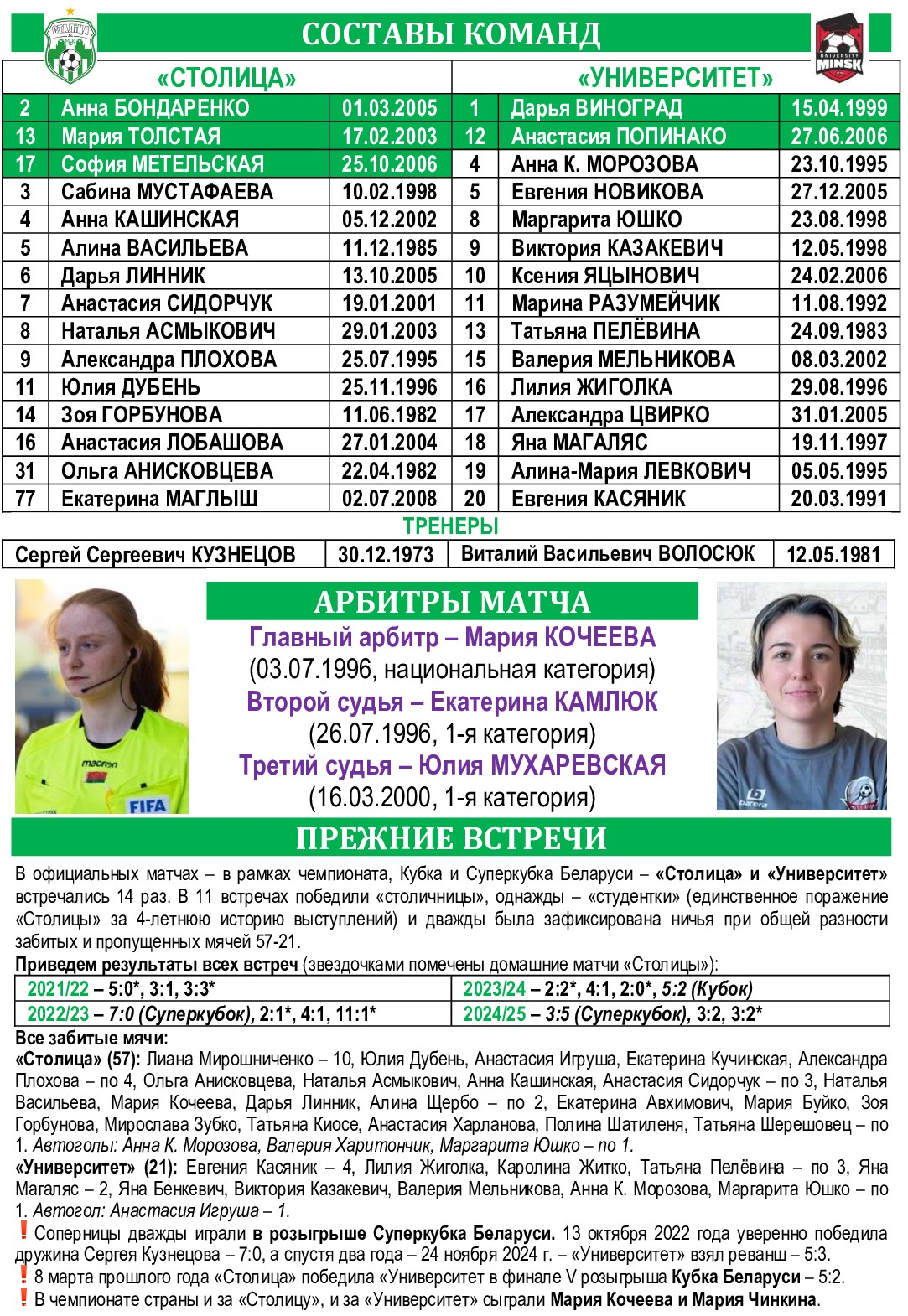 Лучшие бомбардиры Кубка: Валерия Мельникова (Университет) – 3, Ольга Анисковцева, Наталья Асмыкович, Анна Кашинская (все – Столица), Александра Цвирко (Университет) – по 2.