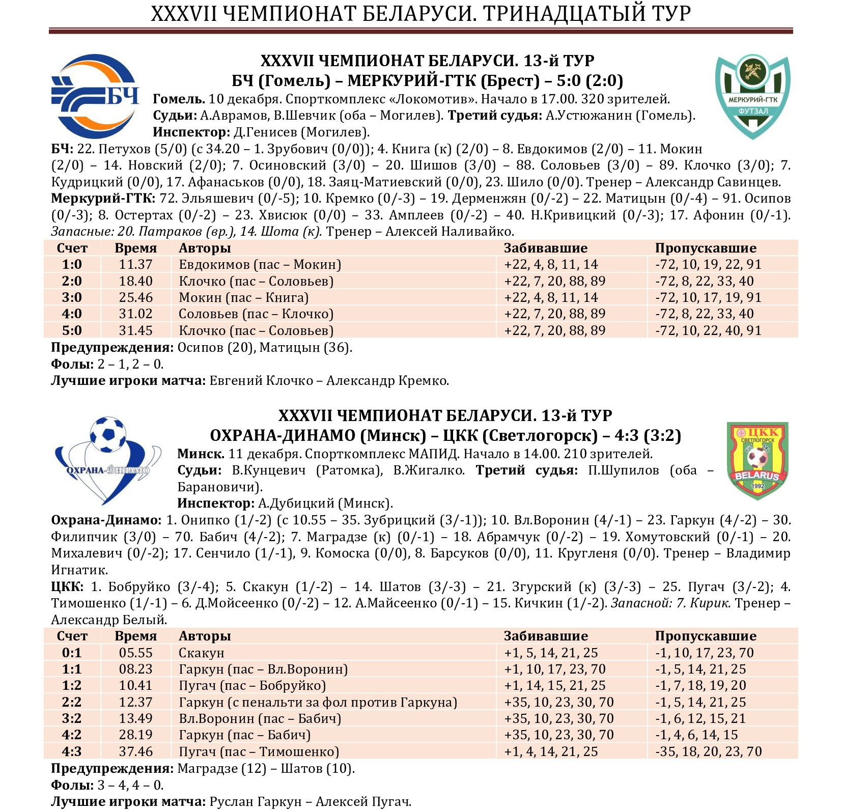 По традиции на сайте МФК «Столица» мы подводим итоги прошедшего тура с полной статистикой всех матчей, где указаны не только ассистенты при голевых «выстрелах», но и показатели по системе «плюс/минус» (статистический показатель полезности игрока, который отражает разность забитых и пропущенных командой мячей в то время, когда тот или иной игрок находился на площадке). Турнирная таблица, списки лучших бомбардиров, снайперов и самых полезных, символическая сборная, лучший игрок тура, ссылки на видеотрансляции и видеообзоры, 10-ка самых красивых голов, выпуски телепрограмм «Ясно о мини-футболе» и «Пятый полевой», репортаж об итогах из газеты «Прессбол» – вся информация о минувшем туре под одним заголовком!