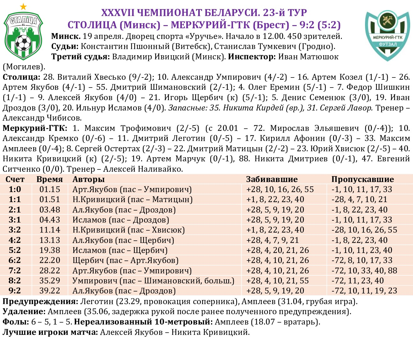 Досрочно, за четыре матча до окончания двухкругового турнира, «Столица» стала победителем «регулярки», пройдя дистанцию из 20 встреч без единого поражения. Победа над брестским «Меркурием-ГТК» органично вписалась в эту уникальную серию, позволив нашему клубу стать недосягаемым для преследователей. Любопытно, что лишь второй раз в биографии команды она стала лучшей по итогам регулярного чемпионата. Впервые – в сезоне-2016/17, набрав тогда под руководством Андрея Толмача в 30 матчах 73 очка (81,1%), сейчас же процент набранных очков куда выше – 96,7! Девять лет назад «Столица» и в плей-офф не знала себе равных, завоевав свой второй чемпионский титул! Следующий матч – в среду в Лиде. Верим в команду!