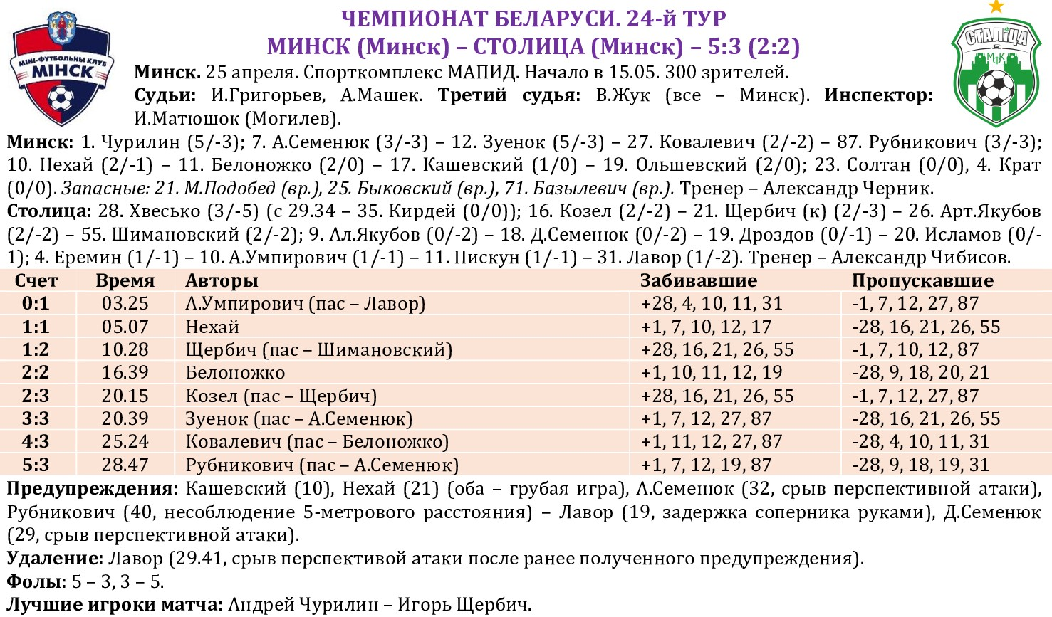 По традиции на сайте МФК «Столица» мы подводим итоги прошедшего тура с полной статистикой всех матчей, где указаны не только ассистенты при голевых «выстрелах», но и показатели по системе «плюс/минус» (статистический показатель полезности игрока, который отражает разность забитых и пропущенных командой мячей в то время, когда тот или иной игрок находился на площадке). Турнирная таблица, списки лучших бомбардиров, снайперов и самых полезных, символическая сборная, лучший игрок тура, ссылки на видеотрансляции, 10-ка самых красивых голов, выпуски телепрограмм «Ясно о мини-футболе» и «Пятый полевой» – вся информация о минувшем туре под одним заголовком!