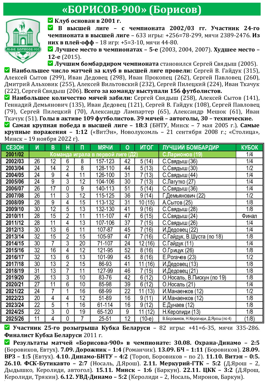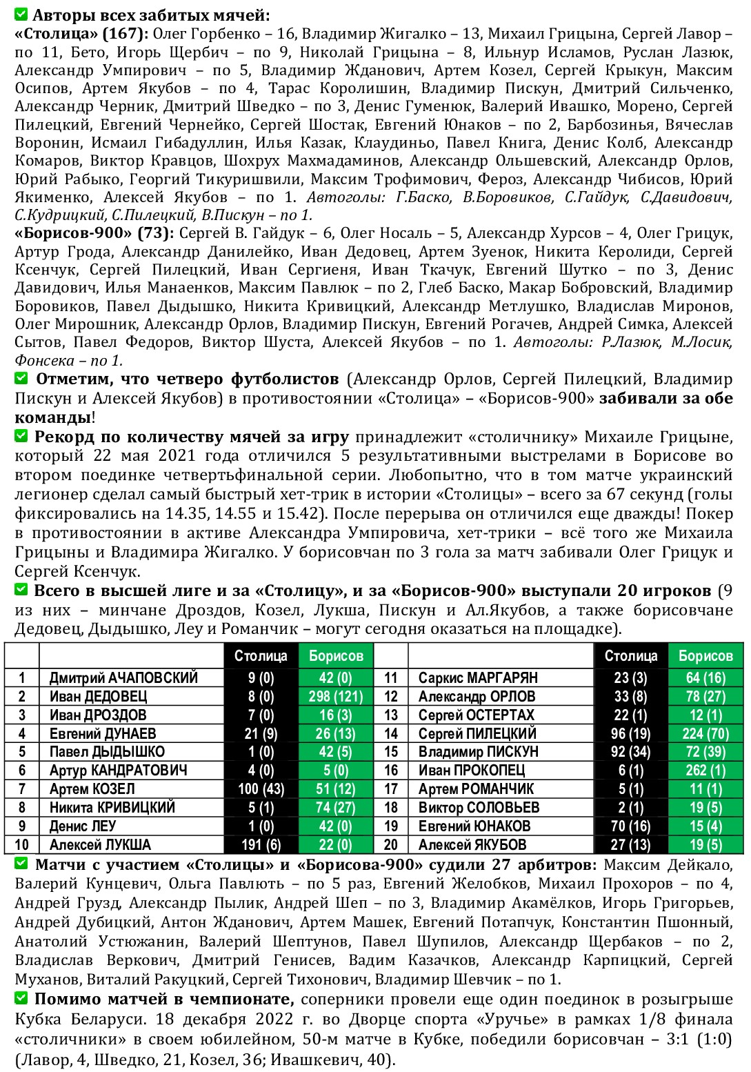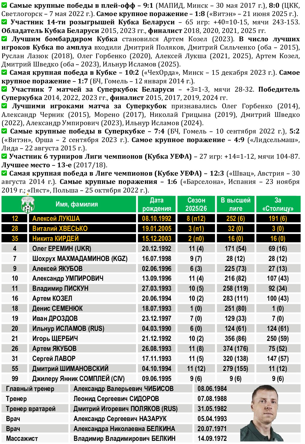Сразу пять футболистов «Столицы» – Алексей Лукша, Александр Умпирович, Дмитрий Шимановский, Игорь Щербич и Артем Якубов – получили вызов в национальную сборную Беларуси, которая после краткосрочного учебно-тренировочного сбора отправится в Словакию, где 17 и 19 декабря проведет два контрольных спарринга с местной дружиной. По традиции дружина Александра Черника перед выездом за границу будет готовиться в гостеприимной Малорите. На Брестчину сборники выдвинутся в пятницу, на следующий день после матчей 13-го тура чемпионата страны. Он венчает соревновательную программу первого круга, и в турнире наступит пауза более чем на два месяца – борьба за титул возобновится только 14 февраля. А в паузе будет определен квартет участников «Финала четырех» Кубка Беларуси (даты его проведения под вопросом, скорее всего – в период с 7 по 11 февраля), а наша главная команда спустя 16 лет примет участие в Словении в финальном турнире чемпионата Европы. Но всё это будет скоро, а вот в четверг, 11 декабря, приглашаем всех болельщиков «Столицы» стать очевидцами и участниками матча с «Борисовом-900». В этом матче в случае нашей победы может произойти несколько важных событий. Во-первых, лидирующая «Столица» имеет прекрасный шанс прийти на промежуточный финиш первой, что в ее истории случалось прежде всего дважды: в сезонах-2017/18 и -2023/24. А вот итоговых побед, напомним, было куда больше – шесть. Причем первая позиция по итогам круга может сохраниться даже в случае ничейного результата, поскольку разность забитых и пропущенных мячей у «Столицы» куда лучше (+49), чем у идущего вторым «Витэна» (+33). Впрочем, о потере очков мы даже не думаем (в 18 матчах подряд борисовчанам в игровое время не проигрываем), поскольку, и это – во-вторых, дружина Александра Чибисова может одержать в четверг 300-ю (!) победу в высшей лиге. А «Борисов-900» (вот как совпали цифры!) может потерпеть в элитном дивизионе 300-е поражение! Отметим, что свои 100-ю и 200-ю виктории «Столица» одержала именно над клубом из Борисова. История движется по спирали! Ждем всех во Дворце спорта «Уручье»! Важны – кожны!
