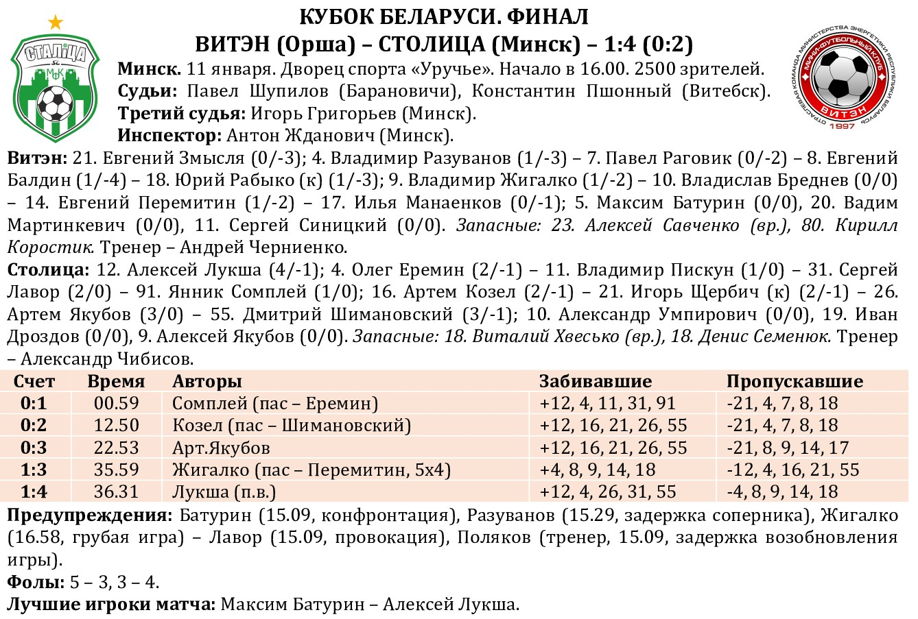 Начинаем возвращать кубки в родной музей! Пока вернули после двухлетней отлучки в Оршу и Гомель Кубок Беларуси! Причем сделали это весьма уверенно, не дав болельщикам ни на секунду усомниться в том, кто же всё-таки хозяин арены! Уже на исходе первой минуты «Столица» повела в счете и не позволила сопернику получить даже минимальный шанс на положительный исход. И снова – вот уже третий матч кряду – в дебюте забивает Янник Сомплей, создавая запевку для коллективного успеха. Затем в борьбе с Артемом Якубовым потерял мяч Павел Раговик, его подхватил Дмитрий Шимановский и отпасовал налево на Артема Козела – 2:0. В начале второго тайма опрометчивая передача назад Евгения Балдина нашла адресата в лице Якубова-старшего. Грех не воспользоваться таким подарком! Играя ва-банк с пятым полевым, оршанцы один мяч сумели отыграть, но тут же ударом по пустым воротам безукоризненно отыгравший Алексей Лукша восстановил перевес в три мяча. И пусть ранее у нас в этом турнире дела обстояли не очень, констатируем, что сейчас на национальной арене «Столице» нет равных. Лидерство в чемпионате, просто шикарное выступление в Кубке. Наш клуб стал трехкратным обладателем трофея. И теперь в прекрасном настроении ждем от наших парней такого же продолжения и в национальной сборной, которой вскоре предстоит участие в финальном турнире чемпионата Европы! А во внутренних соревнованиях пауза до 14 февраля.