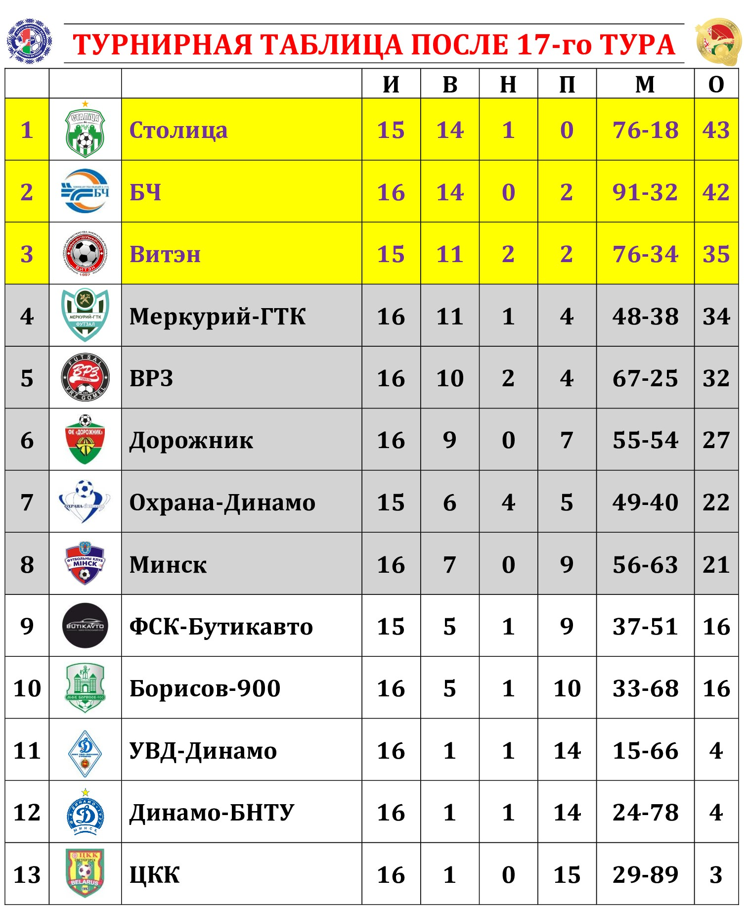 По традиции на сайте МФК «Столица» мы подводим итоги прошедшего тура с полной статистикой всех матчей, где указаны не только ассистенты при голевых «выстрелах», но и показатели по системе «плюс/минус» (статистический показатель полезности игрока, который отражает разность забитых и пропущенных командой мячей в то время, когда тот или иной игрок находился на площадке). Турнирная таблица, списки лучших бомбардиров, снайперов и самых полезных, символическая сборная, лучший игрок тура, ссылки на видеотрансляции, 10-ка самых красивых голов, выпуски телепрограмм «Ясно о мини-футболе» и «Пятый полевой» – вся информация о минувшем туре под одним заголовком!