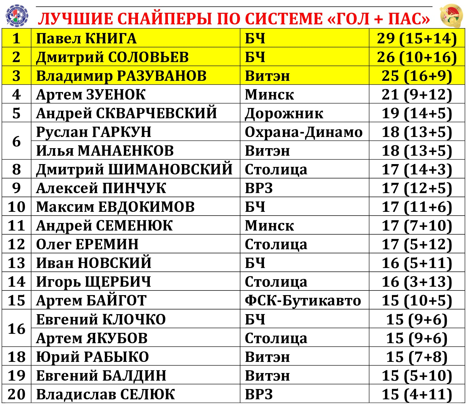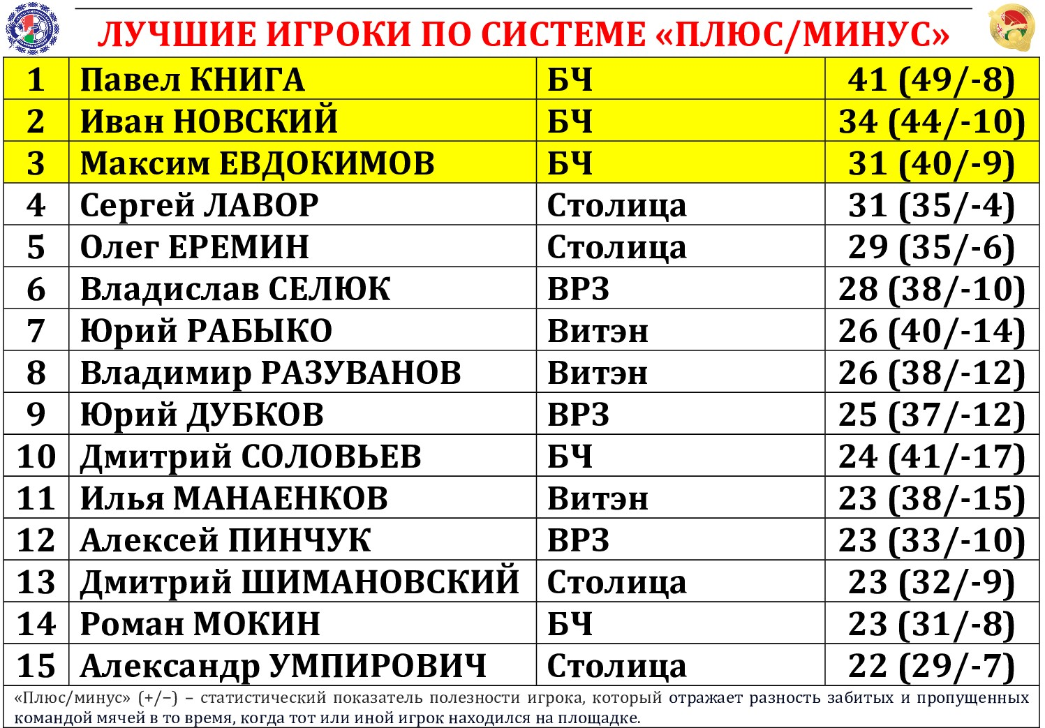 Владимир СТРЕМИЛОВ (ВРЗ); Кирилл ОСИНОВСКИЙ (БЧ) – Андрей ЧИБИСОВ (Меркурий-ГТК) – Артем ЗУЕНОК (Минск) – Янник СОМПЛЕЙ (Столица)