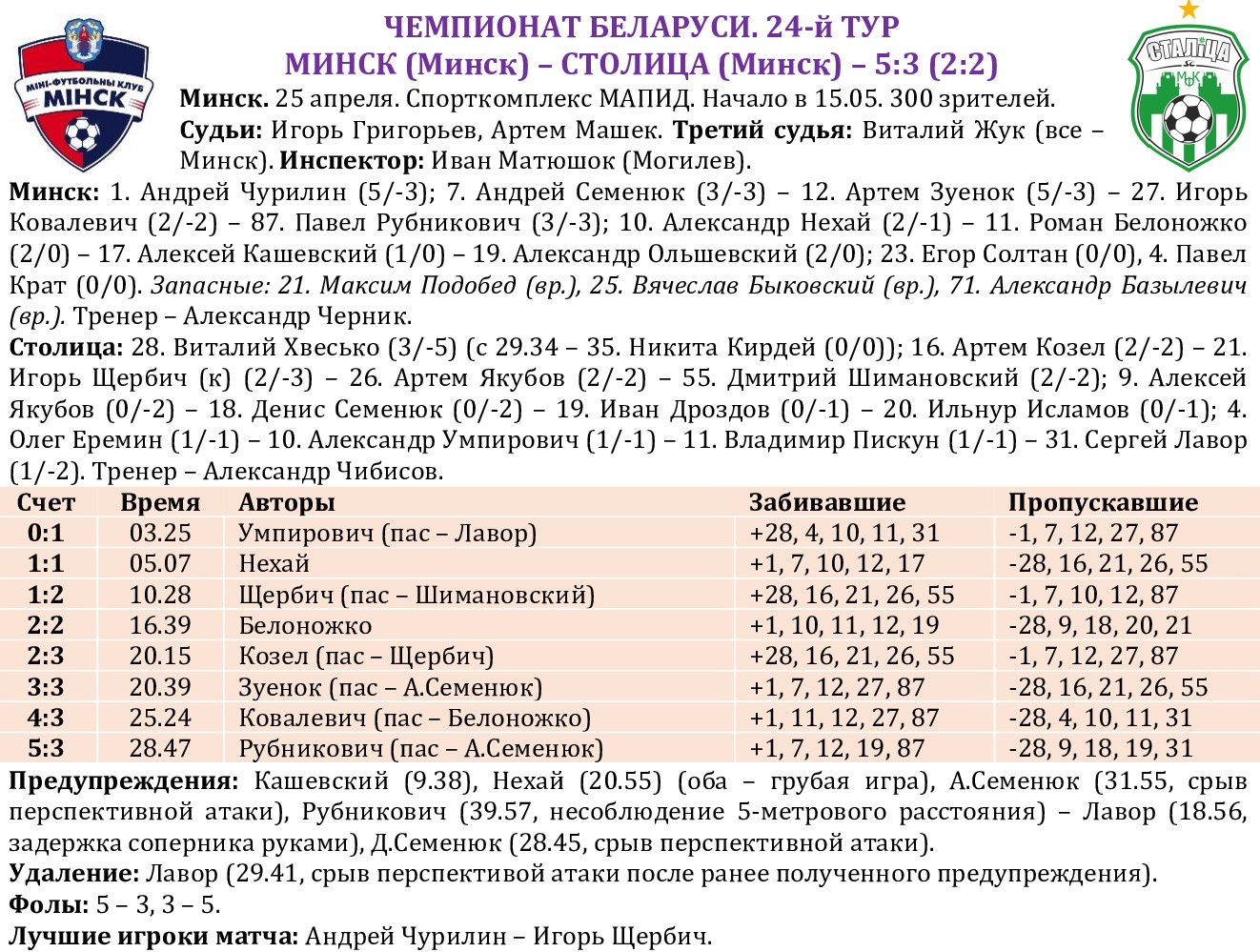 Результаты остальных матчей 24-го тура: 25.04. Витэн – БЧ – 4:3 (3:2) (Разуванов, 5, Раговик, 16, Балдин, 17, 31; Мокин, 2, Шишов, 19, Соловьев, 31). ЦКК – УВД-Динамо – 0:4 (0:3) (Чирич, 8, 11, Маркевич, 10, К.Сидорович, 40). Динамо-БНТУ – ВРЗ - 0:5* (техн. поражение). 26.04. Меркурий-ГТК – Охрана-Динамо – 6:3 (3:1) (Леготин, 1, 22, Хвисюк, 5, Остертах, 18, Осипов, 34, Трофимович, 37; Михалевич, 4, Быцко, 22, Маградзе, 27). ФСК-Бутикавто – Дорожник – 2:1 (2:0) (Сафонов, 3, Живушко, 13; Рабцевич, 29).