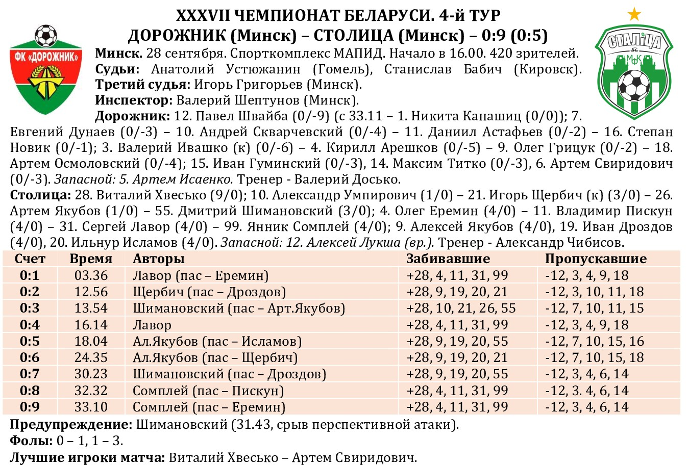 С «Дорожником» «столичники» расправились на удивление легко, что заставило задуматься: это «Столица» так сильна, либо же соперник подошел к матчу не в самой лучшей форме? Уже к перерыву пять пропущенных мячей сняли все сомнения относительно исхода поединка. Через месяц стражу ворот «Дорожника» Павлу Швайбе стукнет 48 лет, а пришлось попотеть как в молодые годы. В созидании голов приняли участие все три квартета гостей. Дублями отметились сразу четыре футболиста – Сергей Лавор, Алексей Якубов, Дмитрий и Янник Сомплей. Так разгромно «Дорожник» нашему клубу еще никогда не проигрывал, а для «Столицы» эта виктория вошла в TOP-15 самых крупных. Отметим, дебютный матч в чемпионатах за «Столицу» Виталия Хвесько (он, будучи игроком «Юни», как-то сыграл в Кубке и в товарищеской матче против сборной), который не только сразу же заработал «сухарь», но и несколькими классными сэйвами способствовал позитивному настрою на площадке и скамейке запасных. Похоже, у Алексея Лукши растет достойная смена.