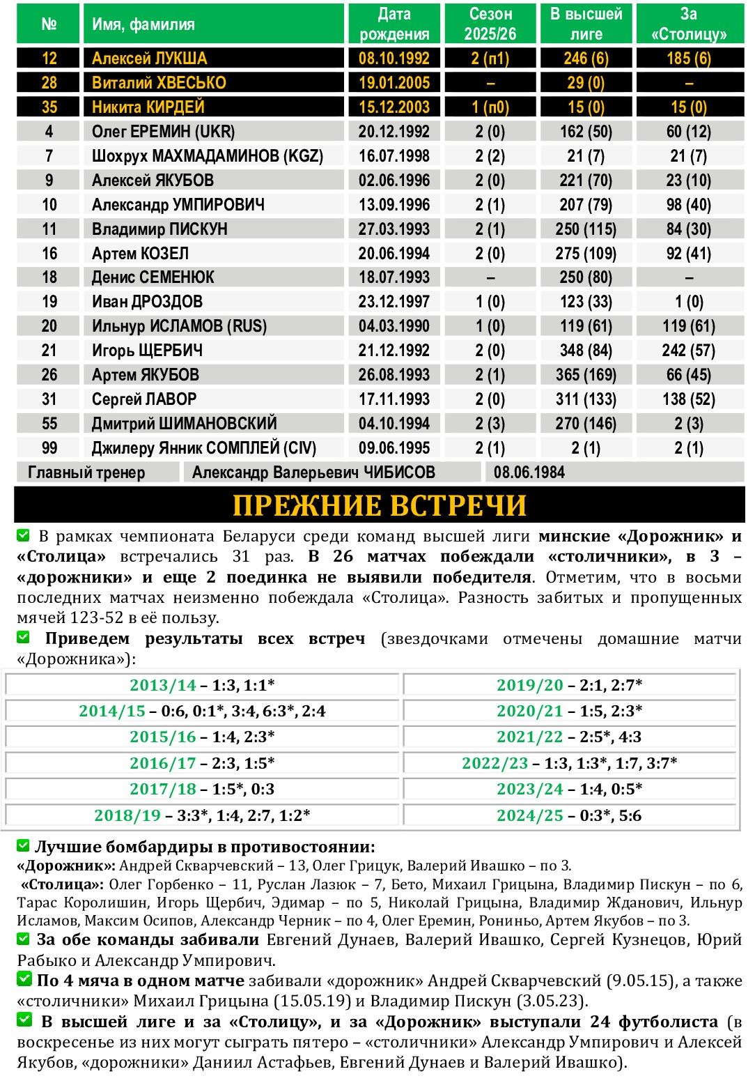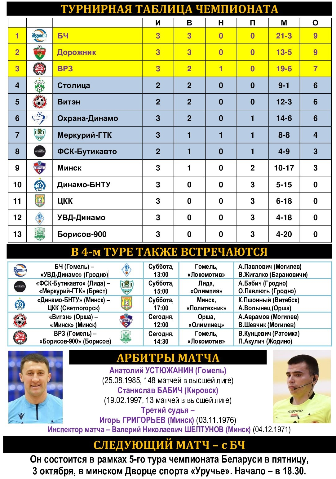 После паузы, вызванной учебно-тренировочным сборном национальной команды, в субботу, 27 сентября, возобновляется чемпионат страны по мини-футболу. «Столица» свой поединок 4-го тура проведет в воскресенье, в гостях у земляков из «Дорожника», которые свои домашние матчи играют в спорткомплексе МАПИД (ул. Шаранговича, 20). Матч начнется в 16.00. Вход для болельщиков на этот раз будет бесплатным, и «столичники» собираются в дальнем от входа секторе на трибуне напротив скамеек команд. Обе команды пока не потеряли в первенстве ни единого очка, все свои матчи выиграв. У «столичников» из-за удаления в прошлом туре пропустит игру Артем Козел, только начал тренироваться в основной группе Денис Семенюк. «С корабля на бал» прилетит из Бишкека Шохрух Махмадаминов, сражающийся со сборной Кыргызстана за путевку на финальный турнир Кубка Азии. Остальные живы-здоровы, хорошенько размялись в товарищеской игре со сборной (против нее и в ее составе!) и желают продлить победную серию против соперника, составляющую уже 8 матчей. Сыграет ли за «Дорожник» отданный из нашего клуба в аренду Даниил Астафьев? Да, сыграет. «Столица» не возражает. Ждем всех наших болельщиков в воскресенье в спорткомплексе домостроителей. Важны – кожны! Конечно, предусмотрена и видеотрансляция матча, посмотреть который можно по этой ссылке: