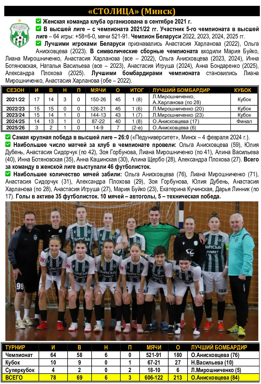 Девчонки «Столицы» свой заключительный матч в календарном 2025 году проведут в воскресенье, 28 декабря. В спорткомплексе МАПИД они будут принимать студенческий коллектив ПолесГУ из Пинска. Начало матча – в 12.20. Прежде проблем с командой Полесского университета «столичницы» не испытывали, победив во всех 4 предыдущих поединках. Возвращается в «Столицу» неувядаемая Зоя Горбунова, объявившая было о завершении выступлений. Видно, яркая игра ровесницы Ольги Анисковцевой, вернувшейся после паузы и наколотившей сразу 6 мячей, послужила наглядным примером и посылом к возобновлению карьеры. Есть же еще порох в пороховницах! Кстати, сразу после игры женщин на площадку выйдут команды U-17 «Столицы» и светлогорского ЦКК, которые сыграют в матче-открытии нового турнира – юношеского чемпионата Беларуси.